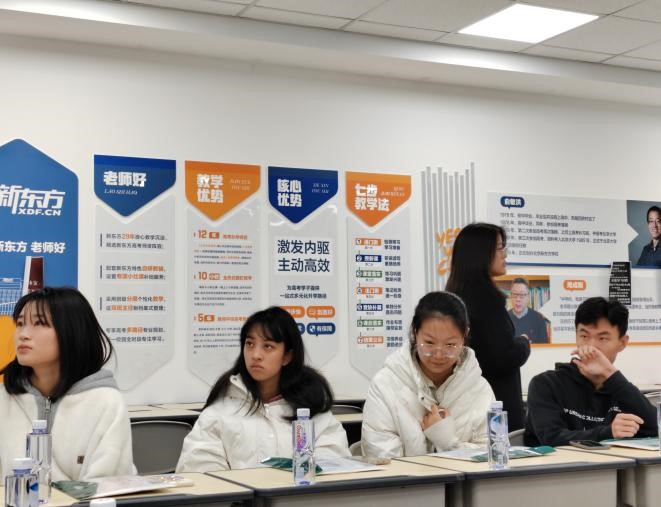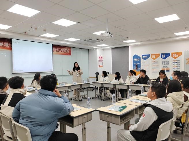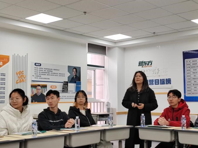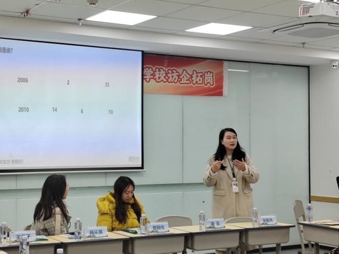 参观结束后,同学们参加了新东方组织的交流座谈会。首先由招聘经理张馨月向同学们介绍新东方的发展历程及业务体系。她介绍道,在国家实行“双减”政策之后,新东方及时调整业务方向,向多元化模式不断发展,现阶段的业务体系包括素质教育、国际教育、老员工教育、基础教育、智慧教育、教育服务、图书文创、电商平台和文旅项目等模块。此外,她还从薪酬福利、晋升渠道、人才培养、能力提升、工作与生活平衡等多个方面,向同学们介绍了在新东方工作的众多优势,也鼓励同学们要和新东方的教育理念一样,成为一个具有“终身学习、全球视野、独立人格、社会责任”的人。