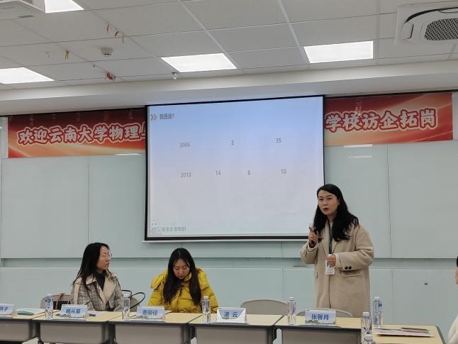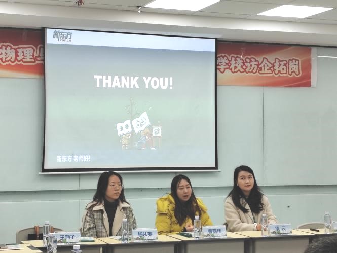 座谈会最后,人力资源部总监凌云老师与同学们进行了深入交流。她提到,现阶段新东方对教师岗位的需求缺口较大,毕业生的学科专业并不会束缚岗位选择,他们鼓励物天学子,要勇于尝试,找到适合自己的职业方向。同学们也针对新东方的薪资福利、晋升渠道和新师培养模式方面进行了询问,凌云老师都一一进行了解答。