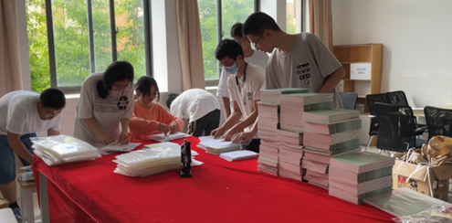 志愿者们在9月8日就早早来到校园,为迎接新同学做好准备,他们下午两点便开始封装员工手册,校历表,公司联系卡,校徽,校史读本等 直到下午六点才全部结束。
