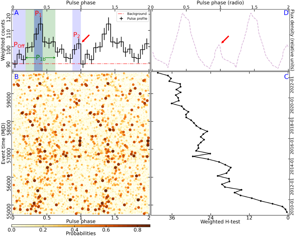 图1:毫秒脉冲星J1835−3259B的脉冲分析结果。A:伽马射线光子概率加权的脉冲轮廓,P1b和P2分别对应伽马射线的脉冲辐射部分,POff为考虑的非脉冲辐射部分。B:伽马射线光子加权事例的时间随相位变化图,颜色表示每个伽马光子来自J1835−3259B的概率。C:判断脉冲探测置信度的H-test值随观测时间的变化结果。D:国际报道的此脉冲星射电脉冲轮廓(红色箭头用于标出一个子脉冲结构,同样可见于伽马脉冲轮廓)。