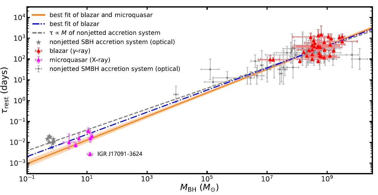 通常认为,耀变体的高能伽马射线辐射直接源自喷流,而微类星体的X射线辐射可能来自喷流,也可能源自热盘。英国365公司官网戴本忠教授领导的课题组利用费米伽马射线空间望远镜(Fermi-LAT)和XMM-Newton X射线望远镜的数据分析了34个耀变体和7个微类星体。研究发现,无论是恒星级的微类星体还是星系级的耀变体,它们的特征阻尼时标和中心黑洞质量之间都存在显著的线性关系。(图1)