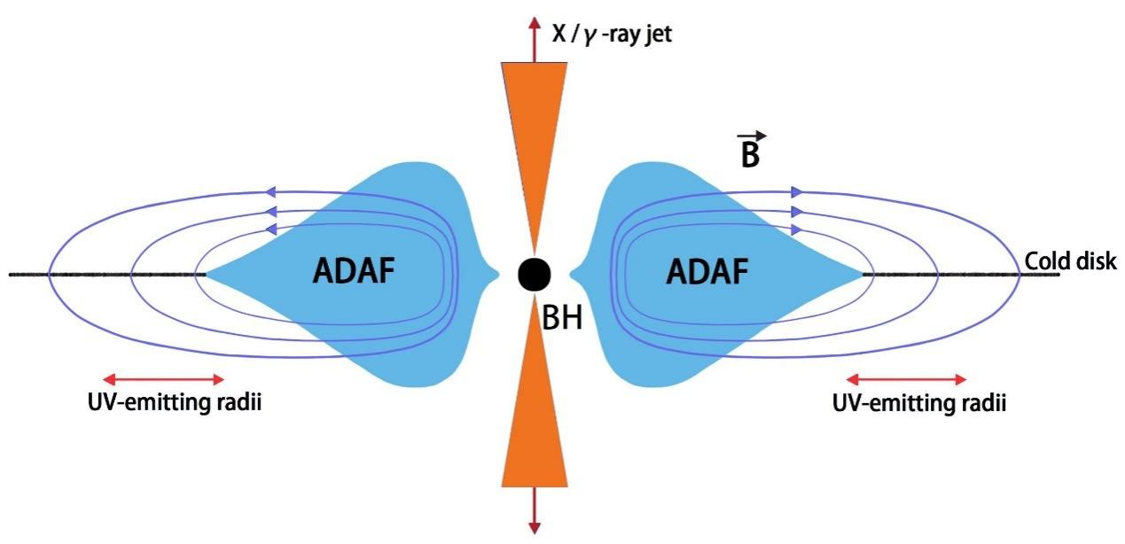 特征阻尼时标是描述天体物理过程的关键参数,其根源可能与吸积盘或喷流内部的物理过程相关。研究表明,耀变体和微类星体的特征阻尼时标可能源自吸积盘紫外辐射区的动力学时标或粘滞时标。这一区域的光变通过吸积盘上的大尺度磁场可以传播至黑洞附近区域(ADAF),从而影响喷流的光变特性(图2)。这一成果为吸积盘与喷流之间的相互作用提供了新的证据。