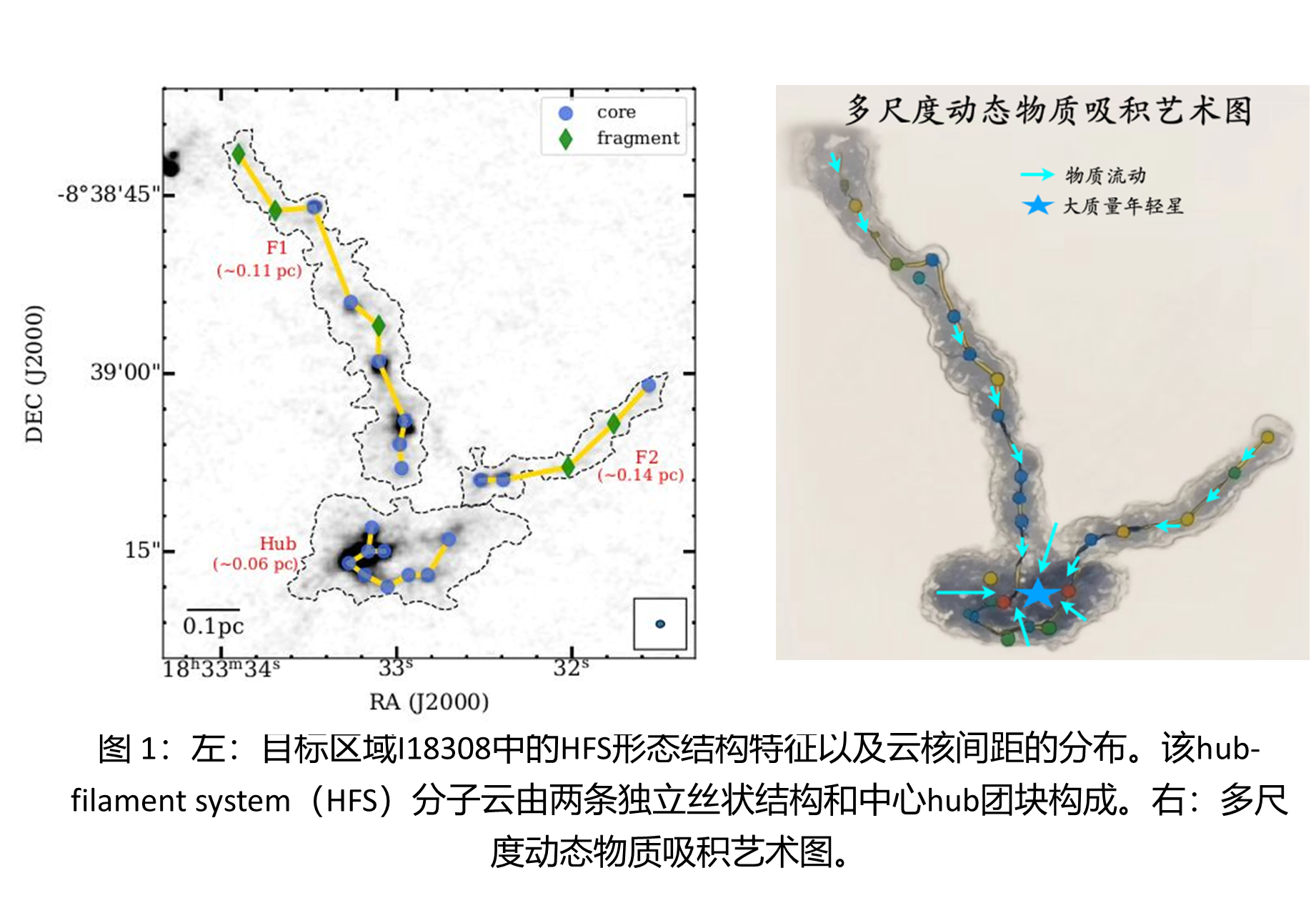 研究人员在整个HFS云中未探测到30倍太阳质量以上的星前核,并发现云核的质量和密度随演化阶段显著系统性增加趋势。这为“多尺度动态物质吸积”的大质量恒星形成图景提供了又一新的观测证据。研究团队认为,I18308目标区域中具有清晰的HFS形态为该图景提供了天然条件——hub处的低质量星前核通过金斯碎裂形成,然后经由引力坍缩过程形成中低质量原恒星,随后通过涉及丝状结构、团块和云核等多尺度物质吸积方式“成长”为最终的大质量恒星(图1右)。